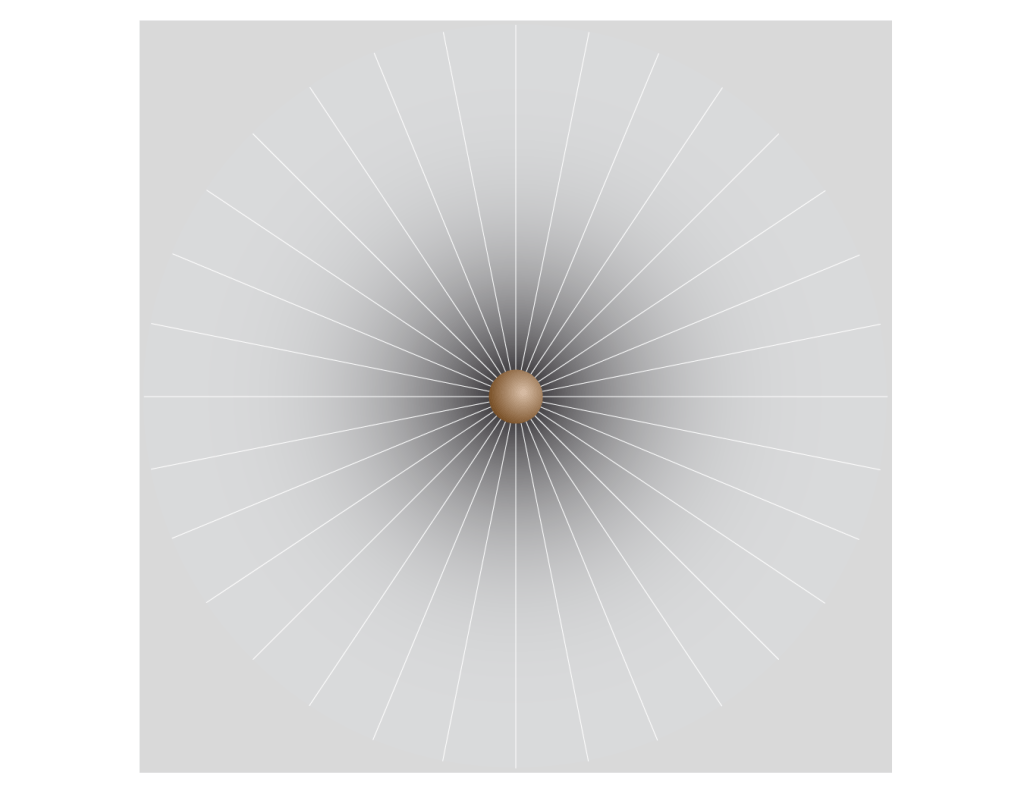 Figure 2 shows a planet, the gravitational vectors (white lines) and the exponential topological deformation of the universal electric field caused by the gravitational vectors. It is vacuum space so the topological deformation corresponds with the gravitational vectors. In other words, we can describe the force of gravity at the macroscopic scale size with the help of the magnitudes of the gravitational vectors (Newton) or by the topological deformation of the universal electric field (Einstein). However, the origin of gravity is the decrease of the magnitude (radius) of one or more scalars of the Higgs field. That is why Newtonian gravity is a more accurate model than Einstein’s “curved spacetime”. Because Einstein didn’t described the volume of the universe, he described the macroscopic topology of the universal electric field around matter. Figure 3 shows in a schematic way the vector mechanism of Newtonian gravity in relation to figure 2 (Newtonian gravity as a push force from vacuum space around matter).