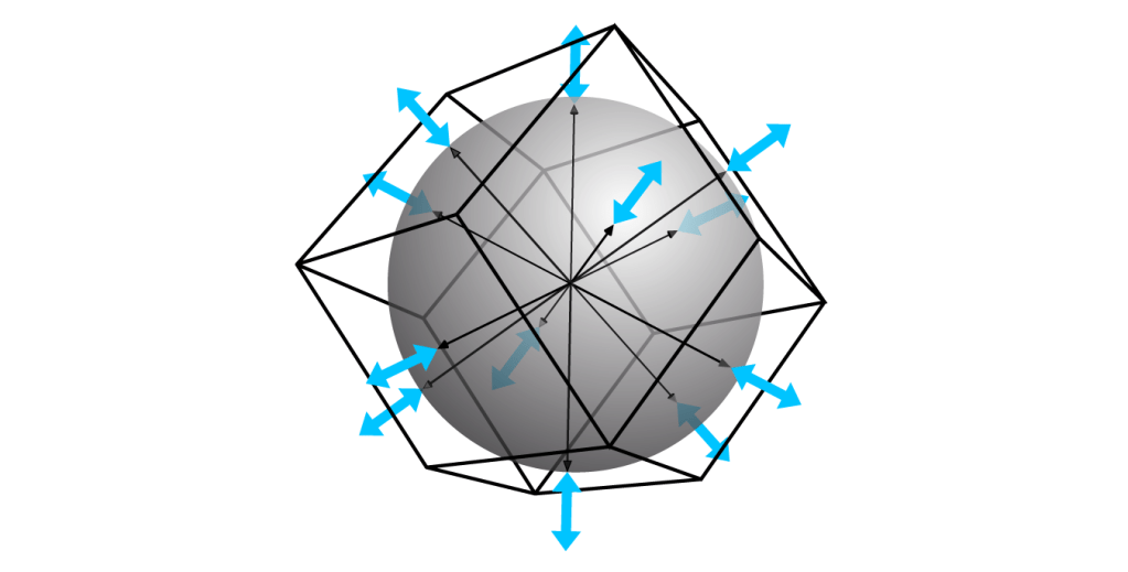 Figure 4 shows in a schematic way one unit of quantised space. Visible is the scalar (inscribed sphere), the schematic boundary of the unit, the vectors that correspond with the 12 points of contact with the adjacent scalars and the continuous topological deformation of the 12 faces of the unit (light blue arrows). A change of the shape of the unit (light blue arrows) results in a change of the scalar vectors (black arrows). The total amount of topological deformation during 1 tq is fixed because in order to change its shape a unit has to transfer volume inside its boundary under influence of the active vectors of the scalar. The consequence is that the local asymmetry between the universal electric field and the corresponding magnetic field changes the direction of the topological deformation of the unit if the asymmetry is not equal distributed. In other words, it is an alteration of the symmetry between both corresponding fields.