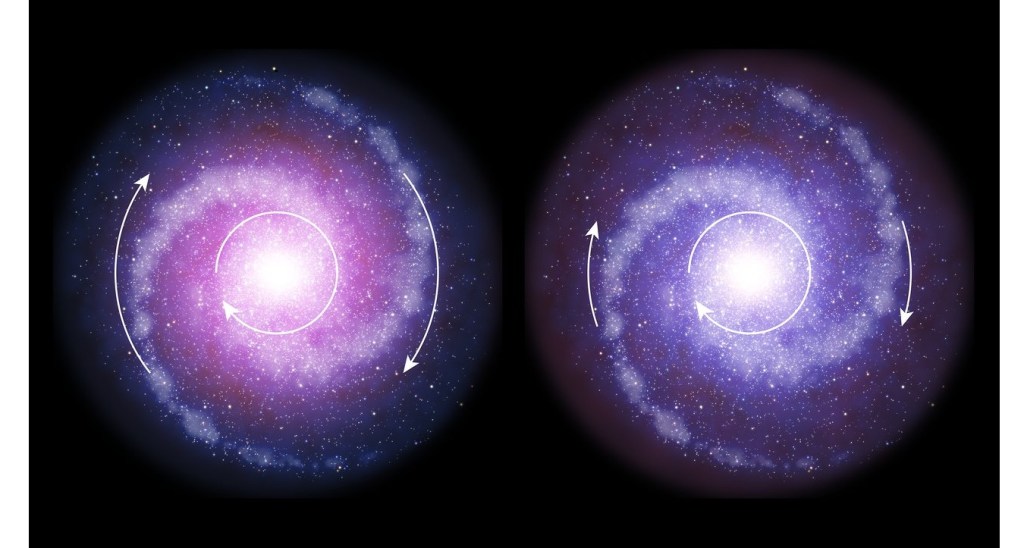 Schematic representation of rotating disc galaxies in the early Universe (right) and the present day (left). Observations with ESO’s Very Large Telescope suggest that such massive star-forming disc galaxies in the early Universe were less influenced by dark matter (shown in red), as it was less concentrated. As a result the outer parts of distant galaxies rotate more slowly than comparable regions of galaxies in the local Universe.