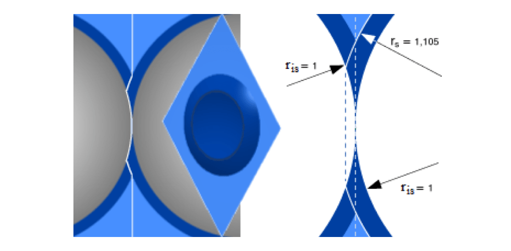 In vacuum space the deformation of a unit of quantised space is limited to the spots around the points of contact of the scalar of the unit and the scalars of the adjacent units around. Figure 1 shows the topological deformation between 2 units (left side). Drawn is the cross section, the face of the right unit and at the right hand a larger cross section (ris = 1.0 is the radius of every scalar where the Higgs field is flat).