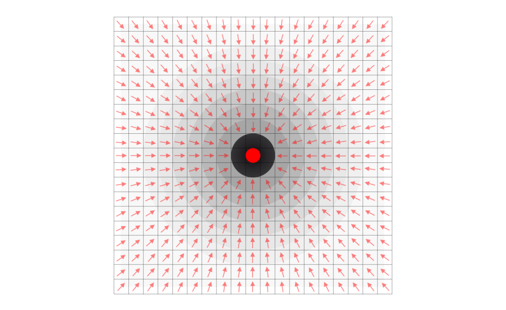 The unbalance creates resulting vectors in vacuum space around (red arrows) and these vectors determine the topological deformation of the deformed part of the units around (rasterised concentric shells). The increasing topological deformation towards the particle is equal to the local energy density of the universal electric field (QFT). The vectors in figure 3 are resulting vectors, because the red arrows represent more than 1 vector of the unit. Like the real shape of the units is not cubic either.