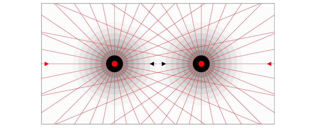 The image in figure 3 shows just 1 rest mass carrying particle. If I draw 2 particles – see figure 4 – the local conditions are quite different. Because the symmetrical distribution of vectors around each particle is disturbed by the other particle (decreased scalars cannot mediate vectors). The effect on both particles is a push from vacuum space around (red) that influences the direction of the propagation of both particles in relation to the rest frame. However, the vectorisation (red arrows in figure 3) originate from the decreased scalar. The consequence is that the sum of the magnitude of the vectors of each particle is a bit comparable with a constant. Although the average properties of vacuum space around influence the size of the volume that can be thought as “vectorised space” (the red arrows that point towards each particle).
