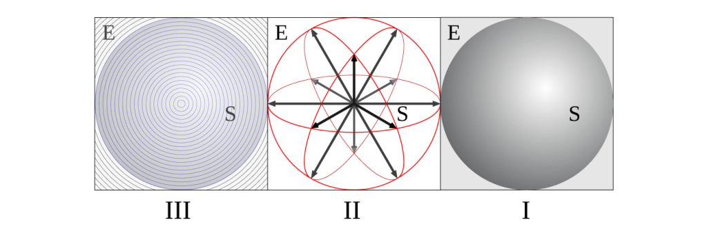 The “nature” of the scalar can be described as the not deformed part of the scalar mechanism of the unit (I). So its resistance against the deformation by the scalar mechanism of the other units around is active in the points of contact with the adjacent scalars. It can be described with the help of vectors (II). However, the scalar mechanism itself is a spherical shape forming mechanism so the scalar represents also the concept of a sphere that is build up by infinite small concentric shells (III), a bit comparable with the layers of an onion. Figure 2 shows the 3 descriptions.