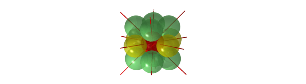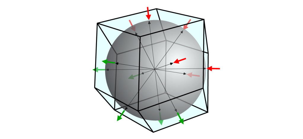 I have drawn a simplified partly transparent unit with the scalar vectors (black) pointing to the positions of the points of contact with the 12 adjacent scalars around (see figure 3). The red and green arrows symbolise the topological deformation of the related faces of the boundary of the unit at a certain moment. In other words, the real shape of the boundary of the unit is a deformed rhombic dodecahedron because the volume of every unit is invariant. The consequence is that the real surface area of the unit is larger than the surface area of the rhombic dodecahedron.