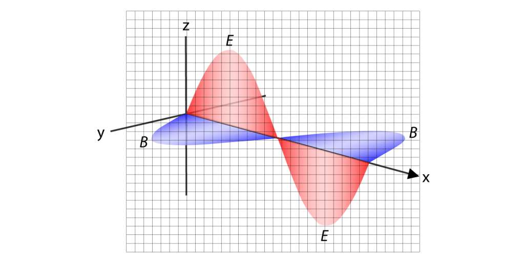 The schematic diagram in figure 5 shows the propagation of an electromagnetic wave in vacuum space. The wave form of the electric field (E) and the magnetic field (B) represent the spatial evolution in the x-direction of the influence of 1 h in relation to the electric and magnetic field around. That means that the transfer of 1 h by the electromagnetic wave is absorbed by the involved units around and than reversed, etc. Actually the waveform is the distribution of the vector and surface area (energy) of the Planck constant on the units around and the following reaction of the units around.