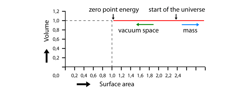 The transfer of topological deformation between the units of quantised space is only possible if the total amount of surface area of all the individual units in the universe is conserved. In other words at the hypothetical “start” of the universe every unit of quantised space has a surplus of surface area in comparison with the amount of surface area of a rhombic dodecahedron with exactly the same volume. Surface area is energy (E = m c2) so it is obvious that the total surplus of surface area of all the units in the universe is conserved. The diagram in figure 4 shows the evolution of the asymmetrical energy distribution (the surplus of energy of the mass is equal to the deficit of the free energy in vacuum space).